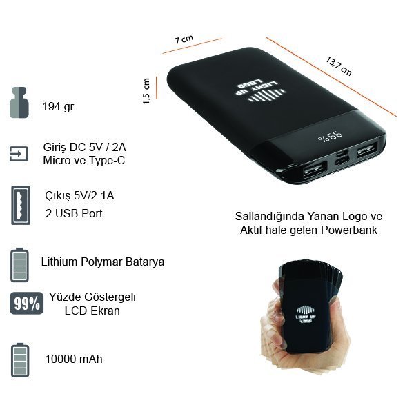 Ürün Adı: LP70 10000 MAH IŞIKLI GÖSTERGELİ KAUÇUK POWERBANK